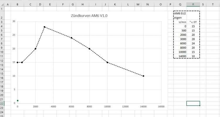 Nach OT zündet keine der Kurven, die schwarze Linie ist der originale ZZP bei meiner AET Zündung, dieser ist konstant bei 20° v OT